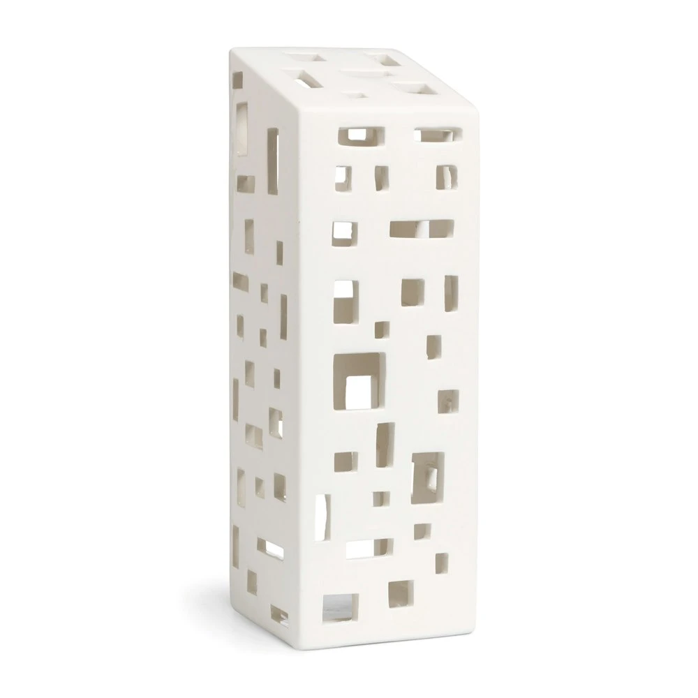 Ein Lichthaus das von modernen Hochhäusern inspiriert ist. Das Haus hat kleine handgeformte Fenster, die schöne Silhouetten und längliche Schatten werfen. Das Lichthaus ist Teil der Urbania Kollektion das fantastischeren Lichthäuser in verschiedenen Formen umfasst. Stelle dieses weiße Hochhaus als Einzelstück oder in Kombination mit mehreren Laternen der gleichen Kollektion auf den Tisch, die Kommode im Flur oder die Fensterbank. Weitere Lichthäuser sorgen für eine bezaubernde städtische Umgebung, die zu jeder Jahreszeit schön leuchtet und flackert.