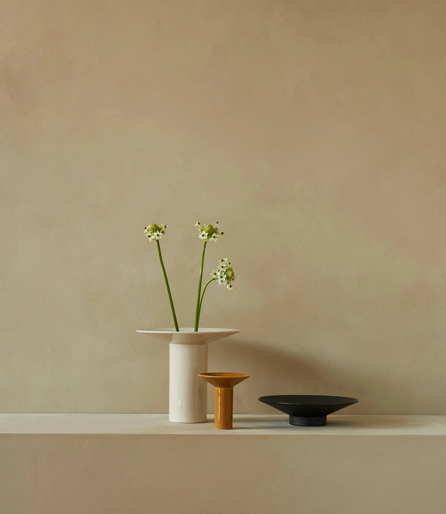 Die Vase von Menu hat eine schlichte, minimalistische Designsprache mit Inspiration aus japanischem Handwerk. Sie ist aus glasiertem Steingut mit unterschiedlichen Optiken hergestellt und hat einen abnehmbaren Blumenfrosch in der Mitte perfekt für frische oder getrocknete Blumen.